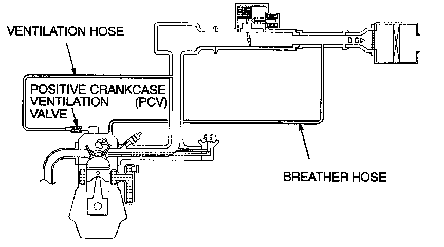 GENERAL INFORMATIONThe positive crankcase ventilation system is a system for preventing the escape of blow-by gases from inside the crankcase into the atmosphere. Fresh air is sent from the air cleaner into the crankcase through the breather hose to be mixed with the blow-by gas inside the crankcase.