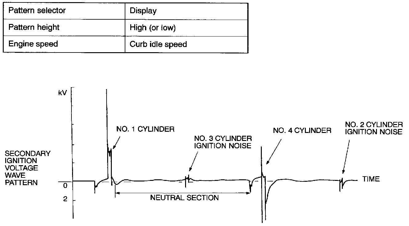 NOTE: Because of The two-cylinder simultaneous ignition system, the waves for two cylinders in each group appear during wave observation. However; wave observation is carried out for the cylinder (Number 1 or 3) with the spark plug cable which has been clamped by the secondary pickup.