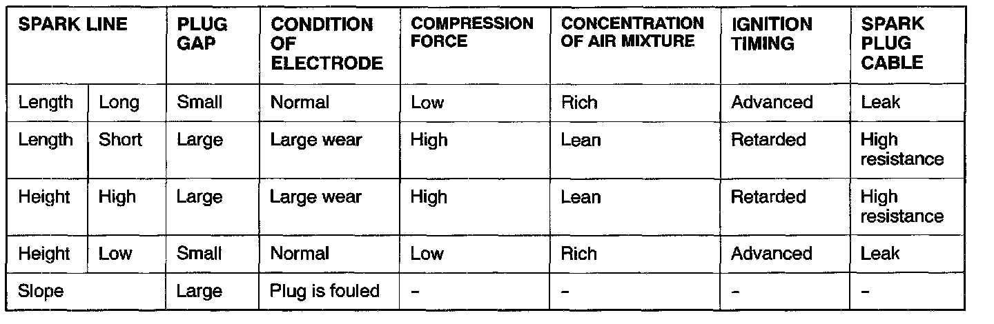 The height, length and slope of the spark line (refer to abnormal waveform examples 1, 2, 3 and 4) show the following trends.