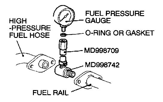 2. Place a suitable O-ring or gasket on assembled special tools MD998709 and MD998742 and install the fuel pressure gauge.