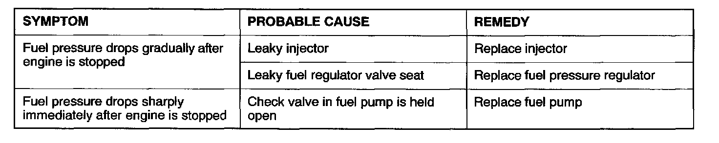 13. Stop the engine and observe fuel pressure gauge reading. It is normal if the reading does not drop within two minutes. If it does, observe the rate of drop and troubleshoot and repair according to the table. Start, then stop the engine.