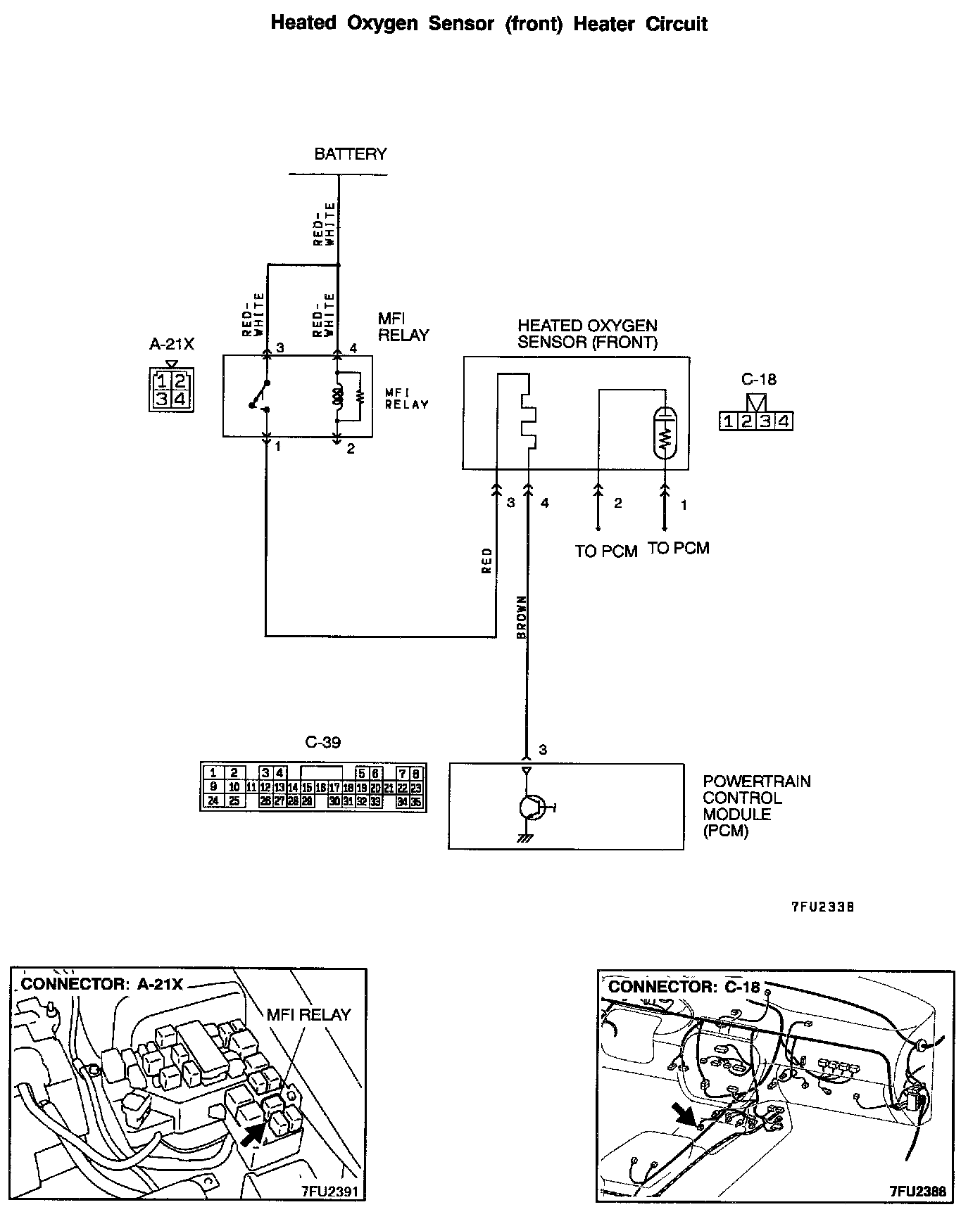 - Power is supplied from the MFI relay (terminal 1) to the heated oxygen sensor (front) heater.