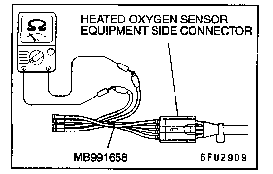 1. Disconnect heated oxygen sensor (rear) connector C-21 and connect test harness special tool, MB991658, to the connector on the heated oxygen sensor (rear) side.