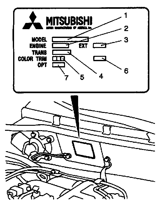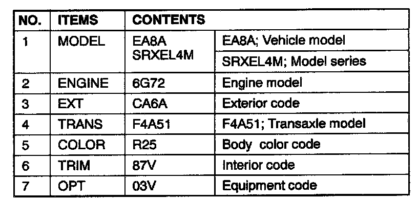The plate shows model code, engine model, transaxle model and body color code.