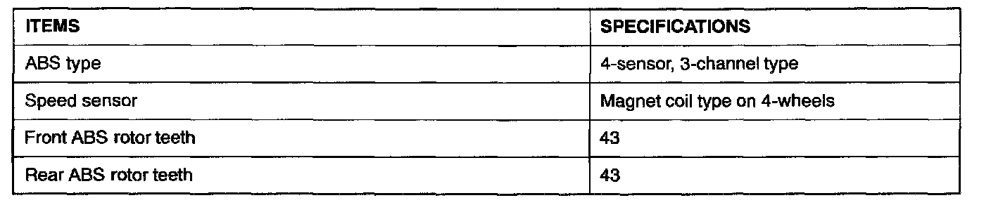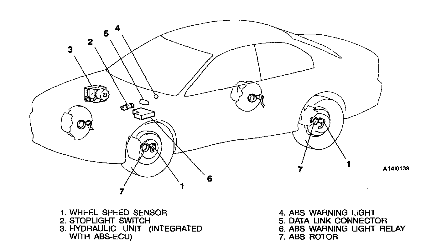 GENERAL DESCRIPTIONThe ABS consists of components such as the wheel speed sensors, stoplight switch, hydraulic unit assembly (integrated with ABS-ECU), ABS rotor, ABS warning light relay and the ABS warning light. If a problem occurs in the system, the malfunctioning components can be identified and the trouble symptoms will be memorized by the diagnostic function.