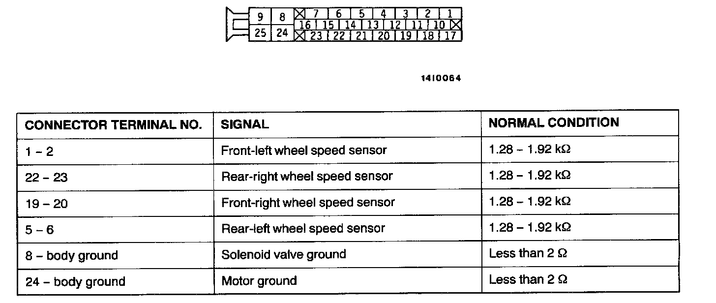 1. Turn the ignition switch to the "LOCK" (OFF) position and disconnect the ABS-ECU connectors before checking resistance and continuity.