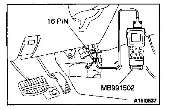 CAUTION: To prevent damage to scan tool MB991502, always turn the ignition switch to "LOCK" (OFF) position before connecting or disconnecting scan tool MB991502.