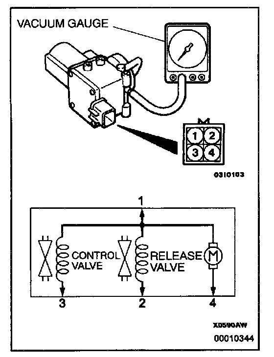 1. Connect the positive battery terminal to auto-cruise vacuum pump connector terminal 1, and the negative battery terminal to terminals 2, 3, and 4. The vacuum gauge should read 27 kPa (8.0 in.Hg) or more.