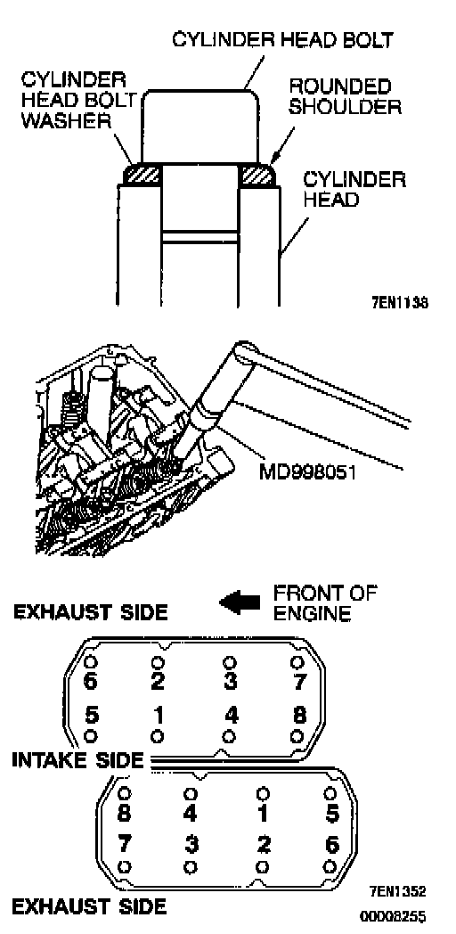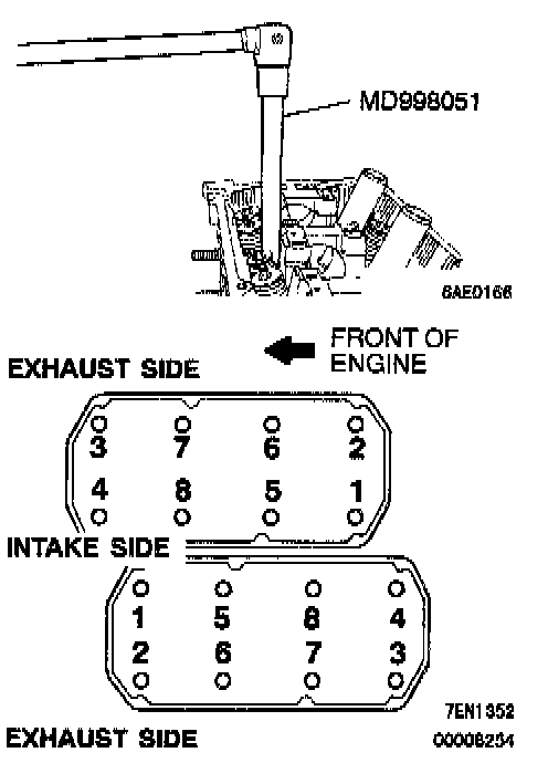 2. Using special tool MD998051 and a torque wrench, tighten the bolts to the specified torque in the order shown in the illustration. (in two or three cycles)