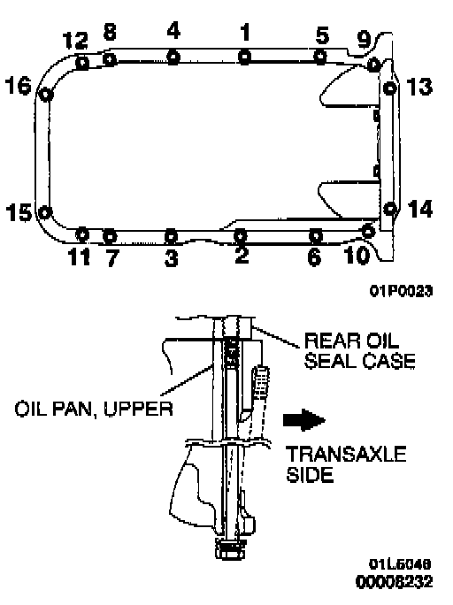 Tighten the oil pan, upper mounting bolts in the order shown in the illustration.