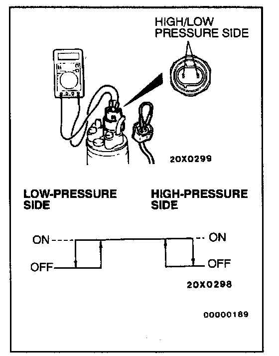 3. When the high/low pressure sides of the dual pressure switch are at operation pressure (ON) and there is continuity between the respective terminals, then the condition is normal. If there is no continuity, replace the switch.