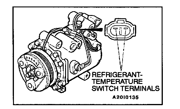 When the A/C is off, check that there is continuity between the refrigerant-temperature switch terminals. If not, replace the switch.