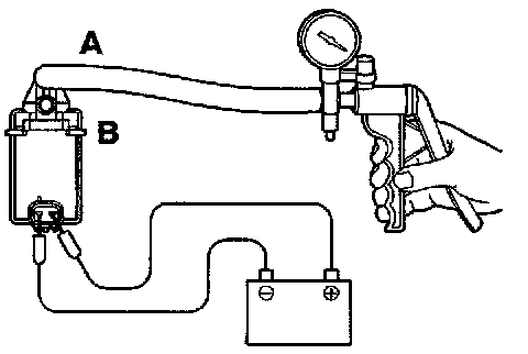 3. Connect a hand vacuum pump to nipple (A) of the EVAP purge solenoid (refer to the illustration at left).