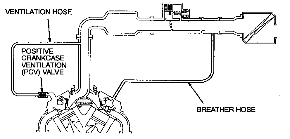 The blow-by gas inside the crankcase is drawn into the intake manifold through the positive crankcase ventilation (PCV) valve.