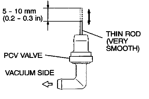 POSITIVE CRANKCASE VENTILATION (PCV) VALVE CHECK1. Hold the PCV valve with the vacuum side down. Insert a thin rod, and using light pressure, depress the end of the PCV valve spring by 5 - 10 mm (0.2 - 0.3 inch). Release pressure on the stick to see if the PCV valve spring will lift the rod to its original position.