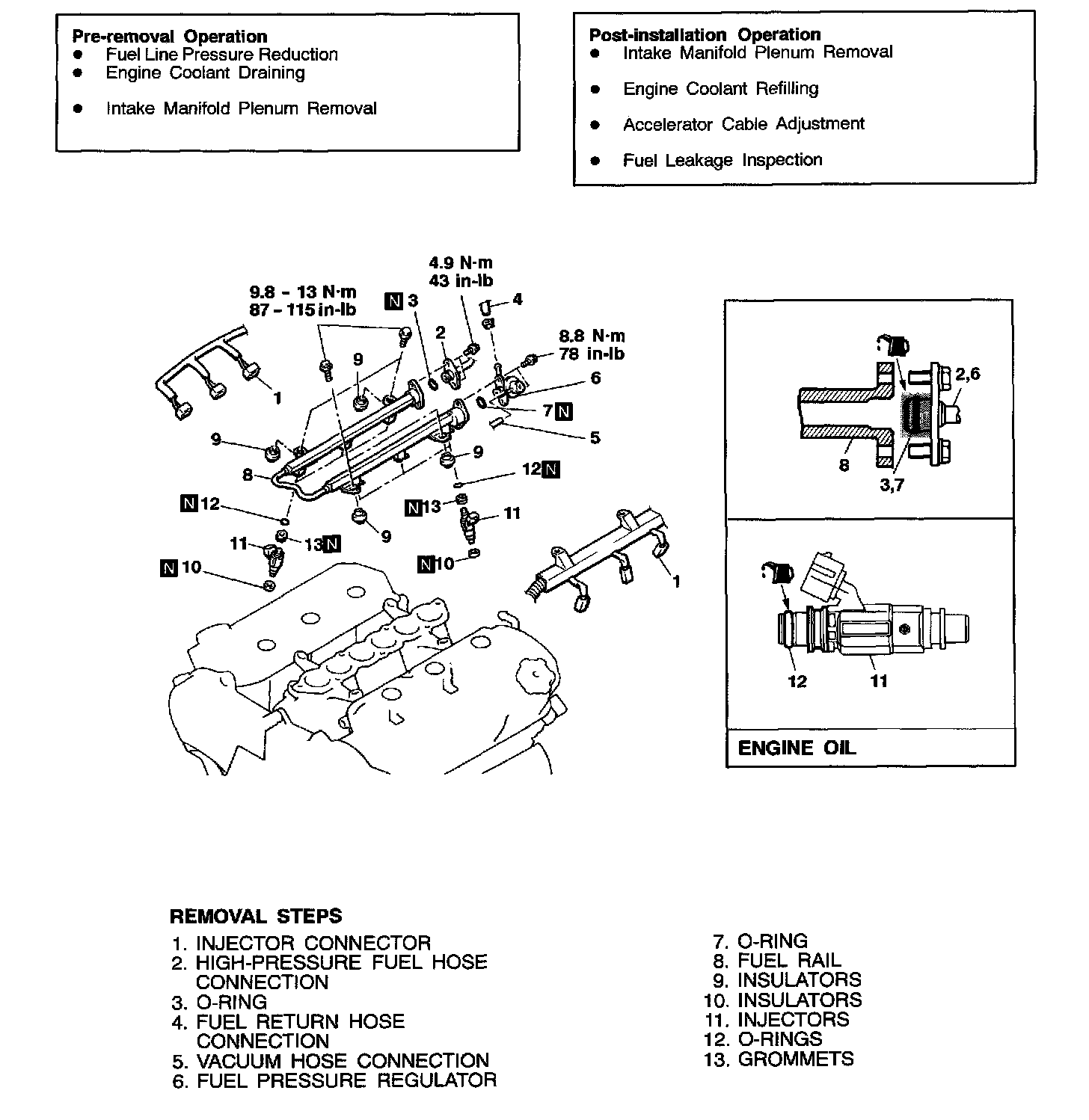 CAUTION: Do not let the engine oil get into the fuel rail will be damaged.