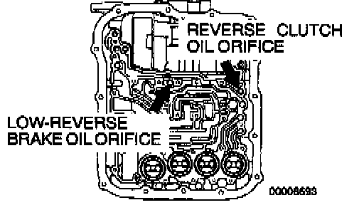 2. Blow compressed air into the reverse clutch oil orifice of the transaxle case. Then check if the reverse clutch piston moves and air pressures are maintained in that condition. Repeat for the low-reverse brake.