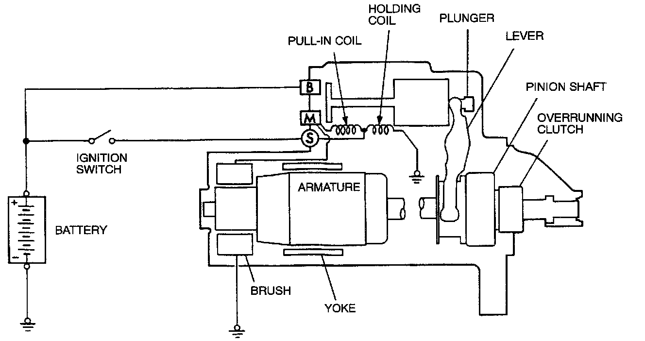 If the ignition switch is turned to the "START" position, current flows in the coil provided inside magnetic switch, attracting the plunger. When the plunger is attracted, the lever connected to the plunger is actuated to engage the starter clutch.
