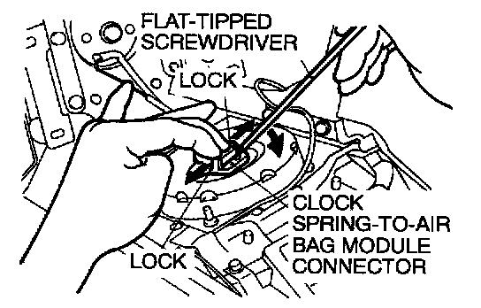 b. When disconnecting the connector of the clock spring from the air bag module, press the air bag's lock toward the outer side to spread it open. Use a flat-tipped screwdriver to pry gently to remove the connector.