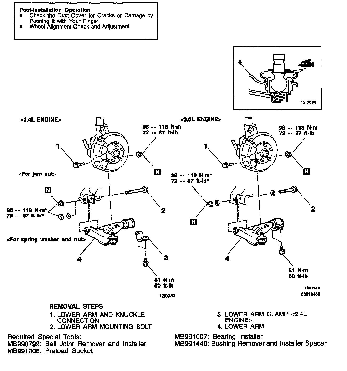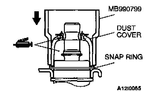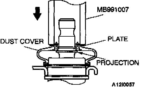 4. Using special tool MB991007, drive in the dust cover plate until it contacts the projection of the ball joint.