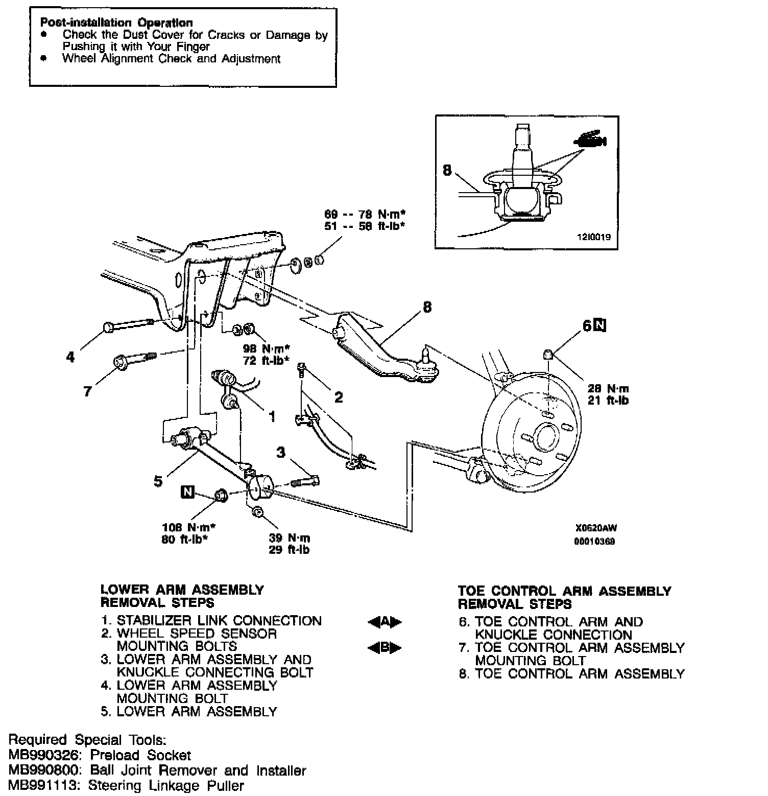 Use special tool MB990635 or MB991113 to disconnect the toe control arm and knuckle.