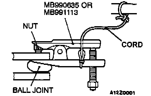- Use special tool MB990635 or MB991113 to loosen the nut only; do not remove it from the ball joint.