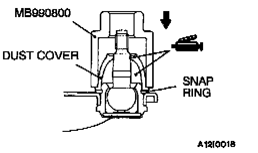 3. Using special tool MB990800 press the dust cover until it contacts the snap ring.