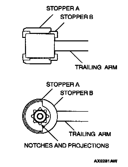 2. Install stopper A in the shown direction while checking that the notches on stopper A are engaged with the projections on the trailing arm bushing.