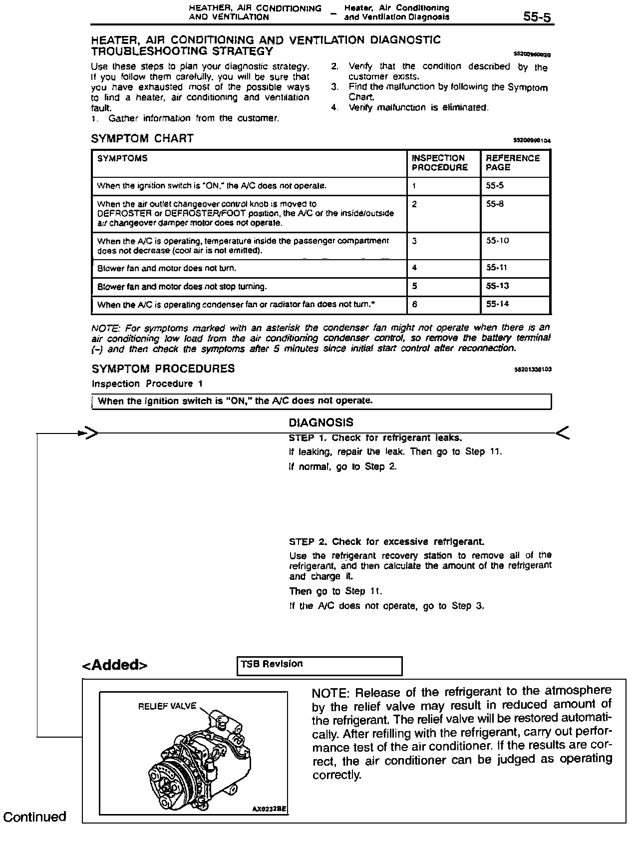 1999-2000 Galant Service Manual, Volume 3, Page 55-5 Add the new A/C relief valve diagnostic information as shown.