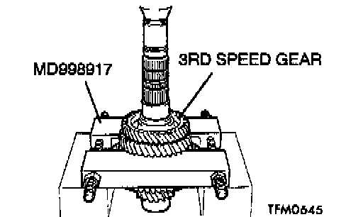 1. Using special tool MD998917, support the 1st speed gear, and then set them on the press.