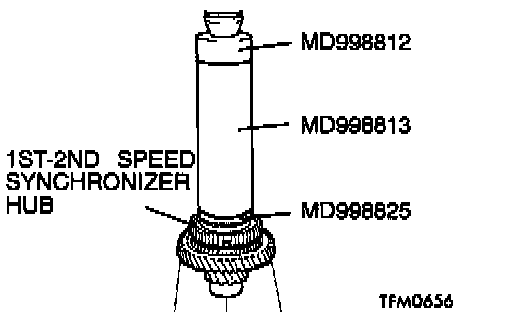 4. Using special tools MD998812, MD998814 and MD998825, press install the 1st-2nd speed synchronizer hub with the press.