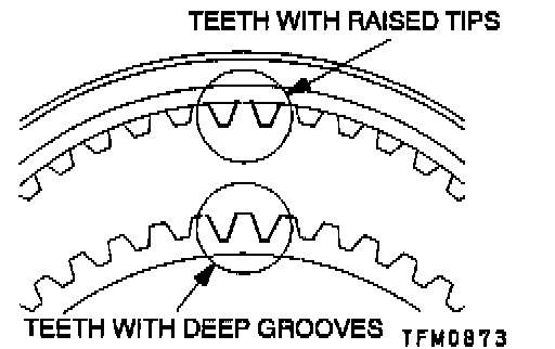 2. Install the synchronizer sleeve so that the areas with teeth that have raised tips (three areas total) are aligned with the areas on the synchronizer hub that have deep grooves between the teeth (three areas total).