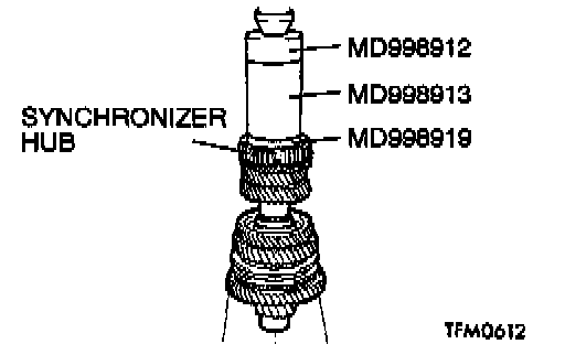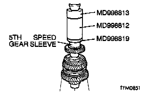 Using special tools MD998812, MD998813 and MD998819, press install the 5th speed gear sleeve onto the output shaft.