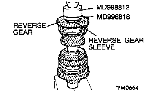 2. Using special tools MD998812 and MD998818, press fit the reverse gear sleeve. Make sure that the reverse gear and the synchronizer ring can rotate freely during the pressing process.