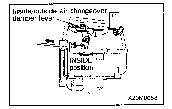 2. Set the inside/outside air changeover damper lever of the heater unit to the INSIDE position as shown in the illustration, and then connect the cable to the lever pin.