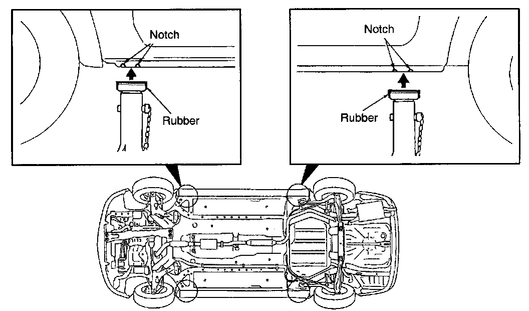 CAUTION: For lifting, put rubber or similar between the side sill and rigid rack, or the side sill area will be damaged.