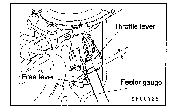 NOTE: The throttle lever opening will widen larger than the set opening if the feeler gauge is inserted more than 3 mm (.12 in.), and adjustment will be impossible.