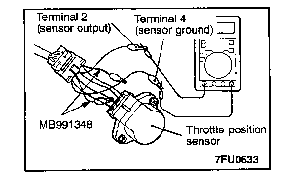 2. Connect a digital voltmeter between the throttle position sensor terminal 2 (sensor output) and terminal 4 (sensor ground.)