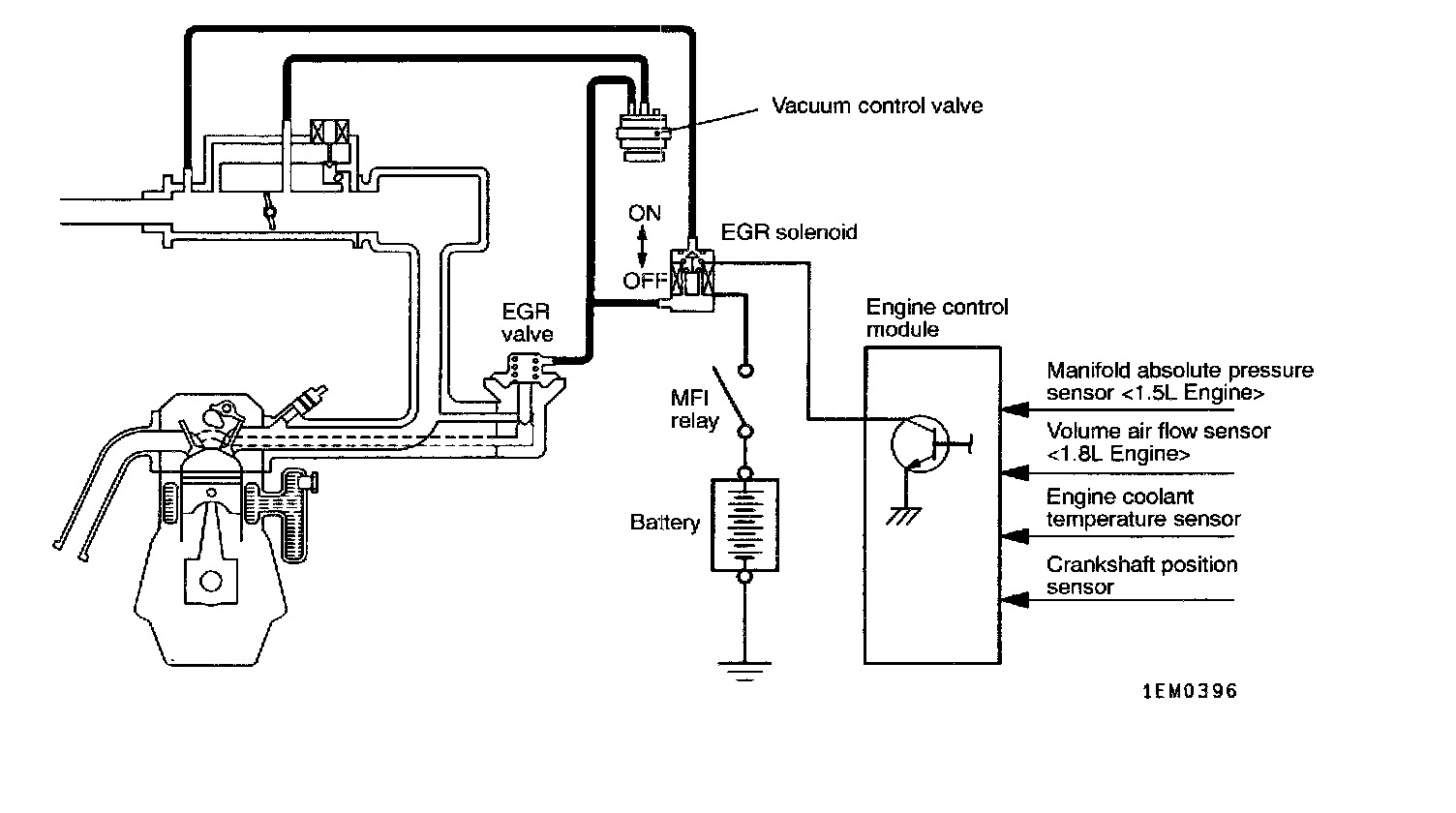 GENERAL INFORMATIONThe exhaust gas recirculation (EGR) system lowers the nitrogen oxide (NOx) emission level. When the air/fuel mixture combustion temperature is high, a large quantity of nitrogen oxides (NOx) is generated in the combustion chamber. Therefore, this system recirculates part of emission gas from the exhaust port of the cylinder head to the combustion chamber through the intake manifold to decrease the air/fuel mixture combustion temperature, resulting in reduction of NOx.