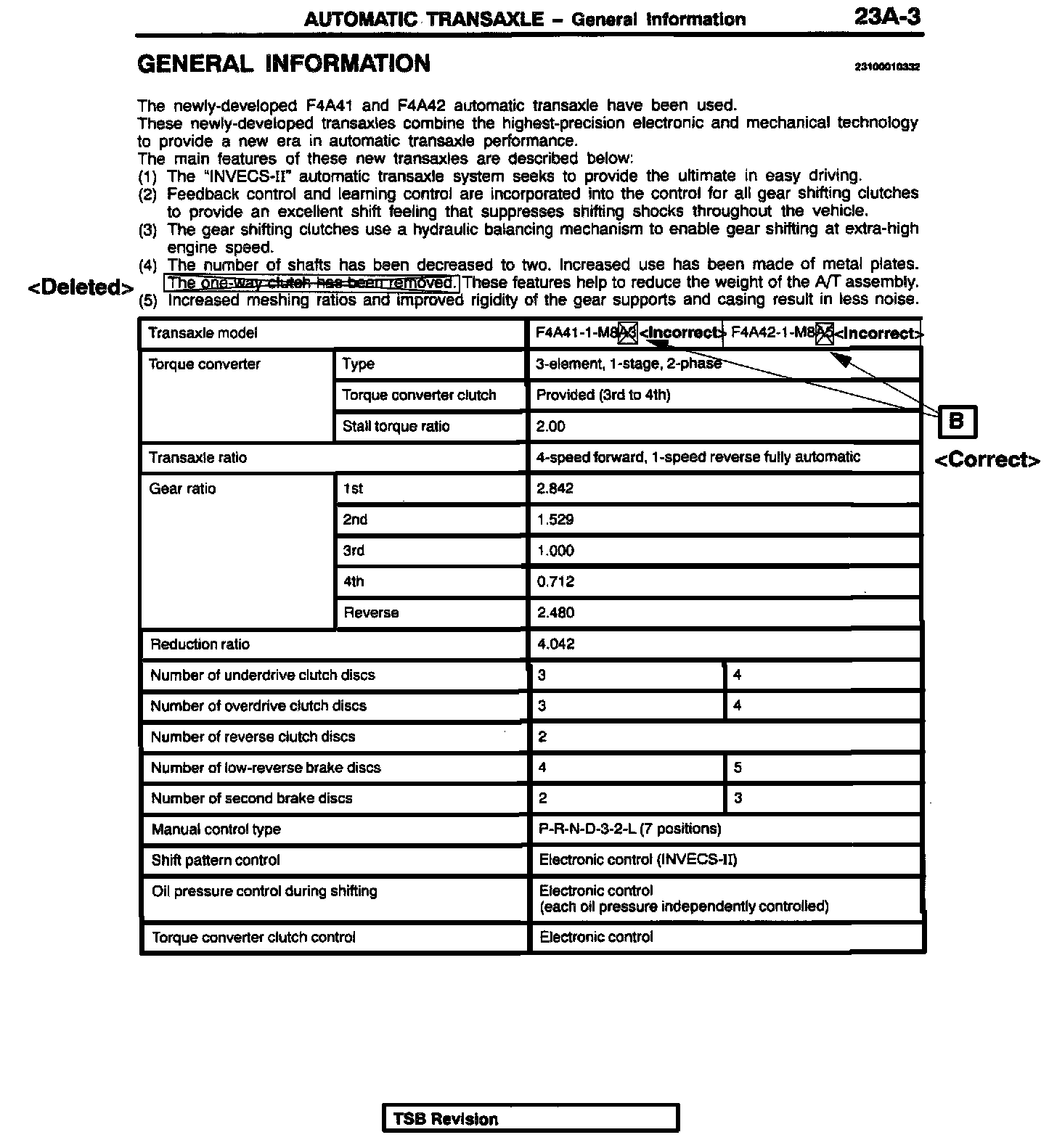 ^ The sentence in GENERAL INFORMATION, step 4, "The one-way clutch has been removed." is deleted. The automatic transaxle in the 2000 Mirage DOES have the one-way clutch.