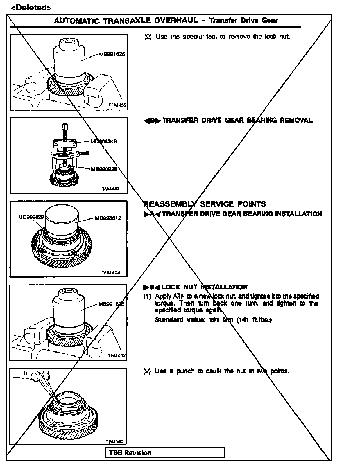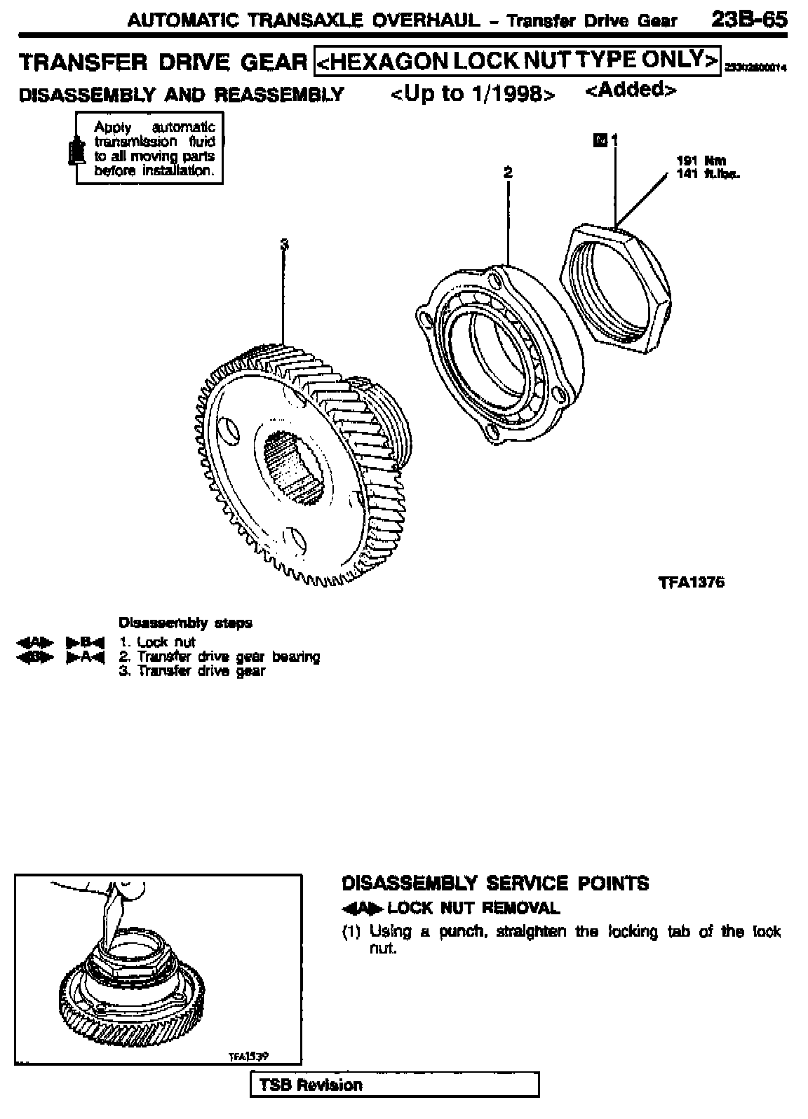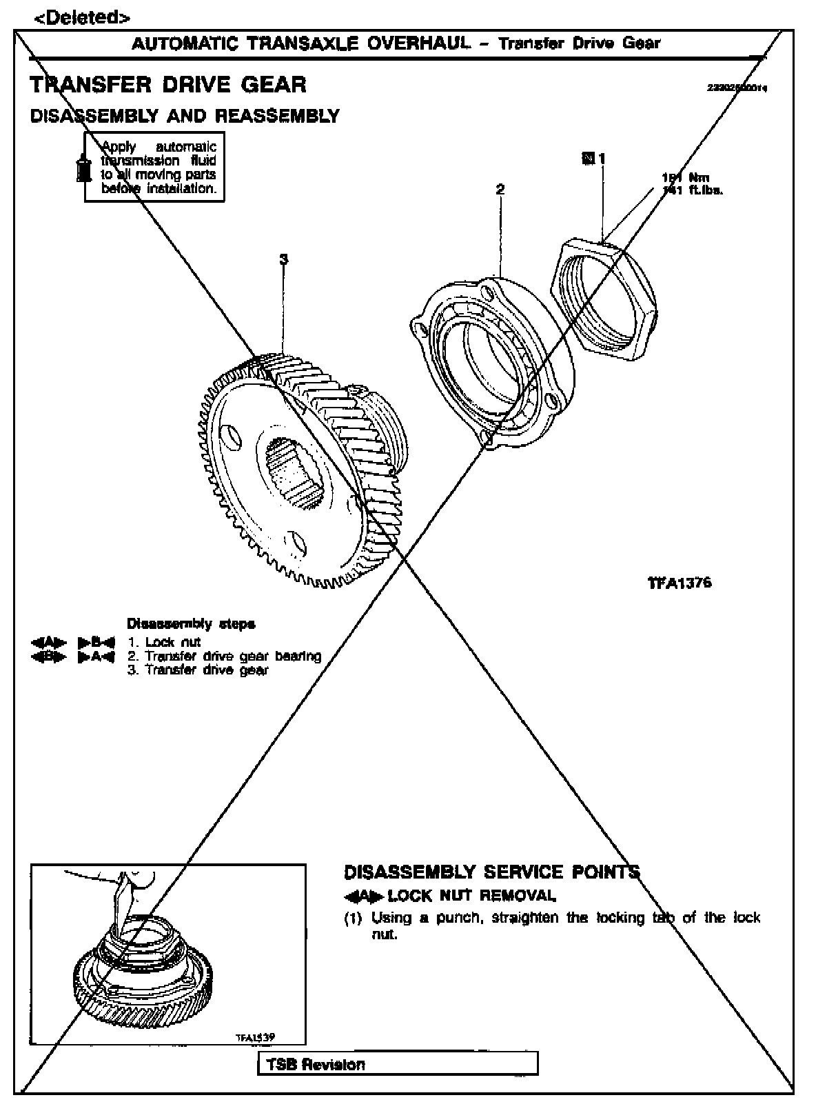 Beginning with January 1998 transaxle production, the shape of the transfer drive gear lock nut was changed. The new style transfer drive gear/nut assembly cannot be disassembled. This bulletin notes this change in the 1998 manual, and deletes transfer drive gear disassembly/reassembly procedures and related items and tools from the 1999 - 2001 manuals.