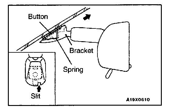 Insert a narrow flat-tip screwdriver into the slit in the inside rear view mirror bracket, keep the spring pushed in and remove the inside rear view mirror in the direction of the arrow in the illustration.