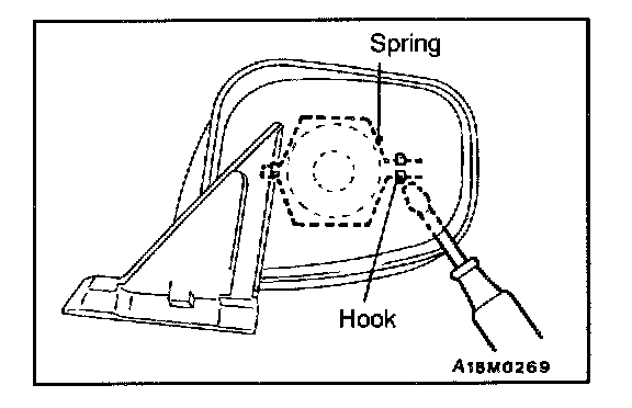 Let the mirror face up, insert a flat-tipped screwdriver wound with masking tape, and remove the mirror by releasing the spring from the hook.