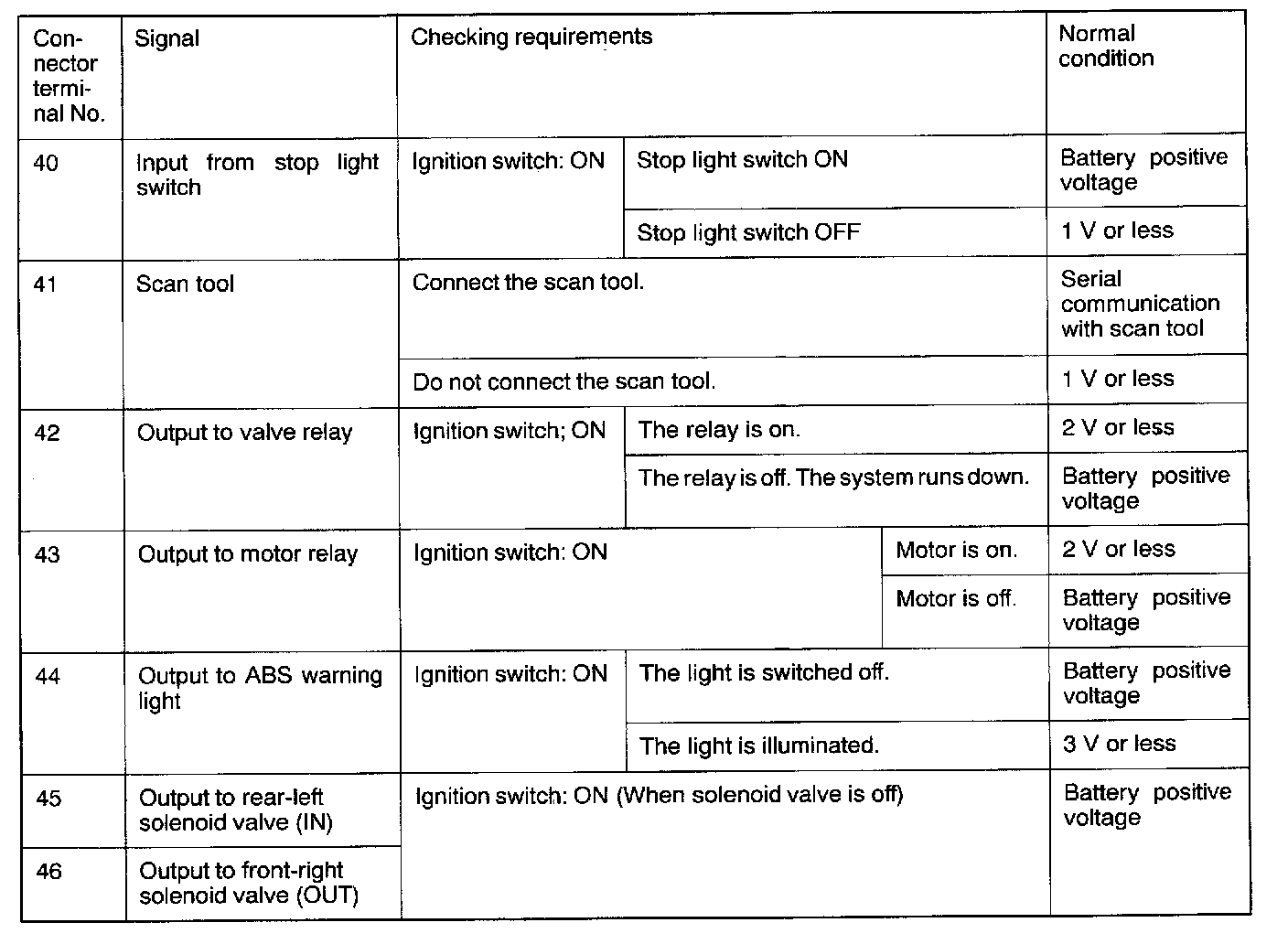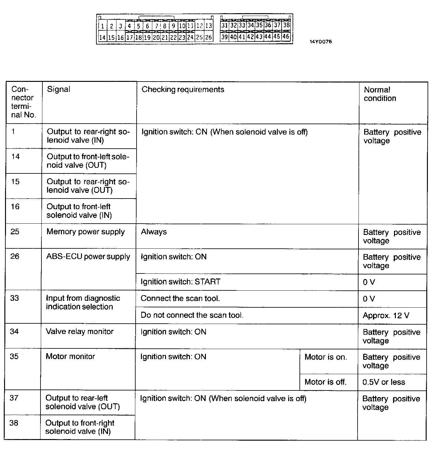 NOTE: Do not measure terminal voltage for approx. 3 seconds after the ignition switch is turned on. The ABS-ECU performs the initial check for that period.