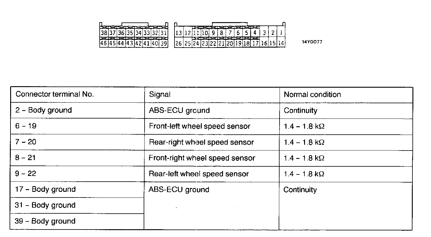 1. Turn the ignition switch off and disconnect the ABS-ECU connectors before checking resistance and continuity.