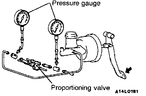 2. Check to be sure that the output fluid pressure is at the standard value when the pedal depression force is increased so that the input fluid pressure is 9.81 MPa (1422 psi).