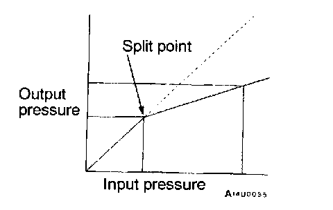 1. Output pressure begins to drop relative to input pressure (split point).