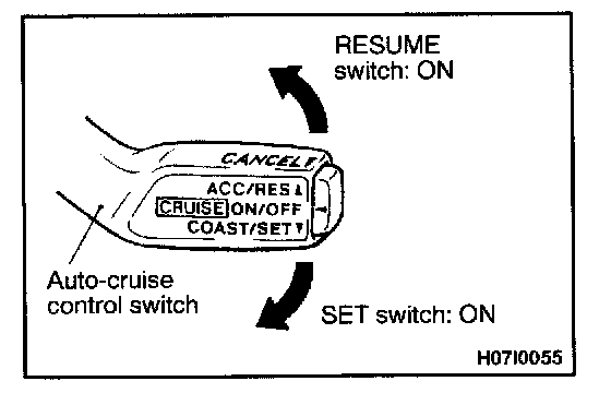1. Turn the ignition switch "ON" with the "SET" switch ON. Then, turn the "RESUME" switch ON within one second.