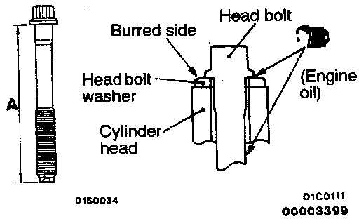 3. Apply a small amount of engine oil to the thread section and the washer of the cylinder head bolt.