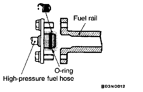 1. When connecting the high-pressure fuel hose to the fuel rail, apply a small amount of new engine oil to the O-ring and then insert the high-pressure fuel hose, being careful not to damage the O-ring.